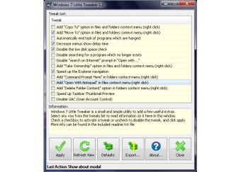 Windows 7 Little Tweaker consente di aggiungere alcune nuove voci al menu contestuale (come "Copia in", "Sposta in" o "Apri con Notepad", tra le altre), disabilitare lo User Account Control, ridurre il tempo di apertura dei menu, velocizzare l'apparizione dell'anteprima delle finestre nella barra delle applicazioni, e altro ancora. Si tratta comunque di migliorie piuttosto marginali.